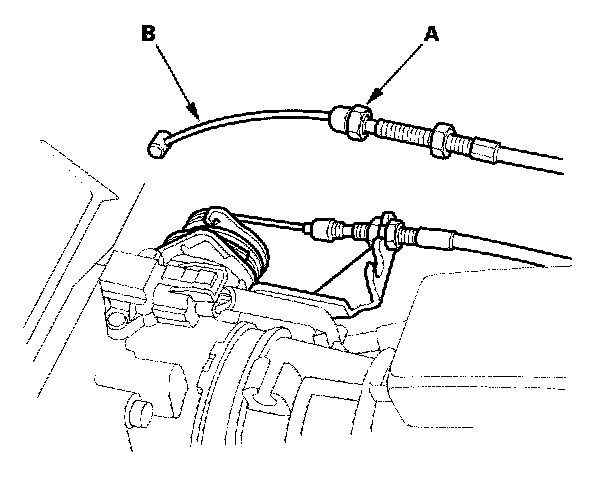 1. Loosen the locknut (A), then disconnect the actuator cable (B) from the throttle linkage.