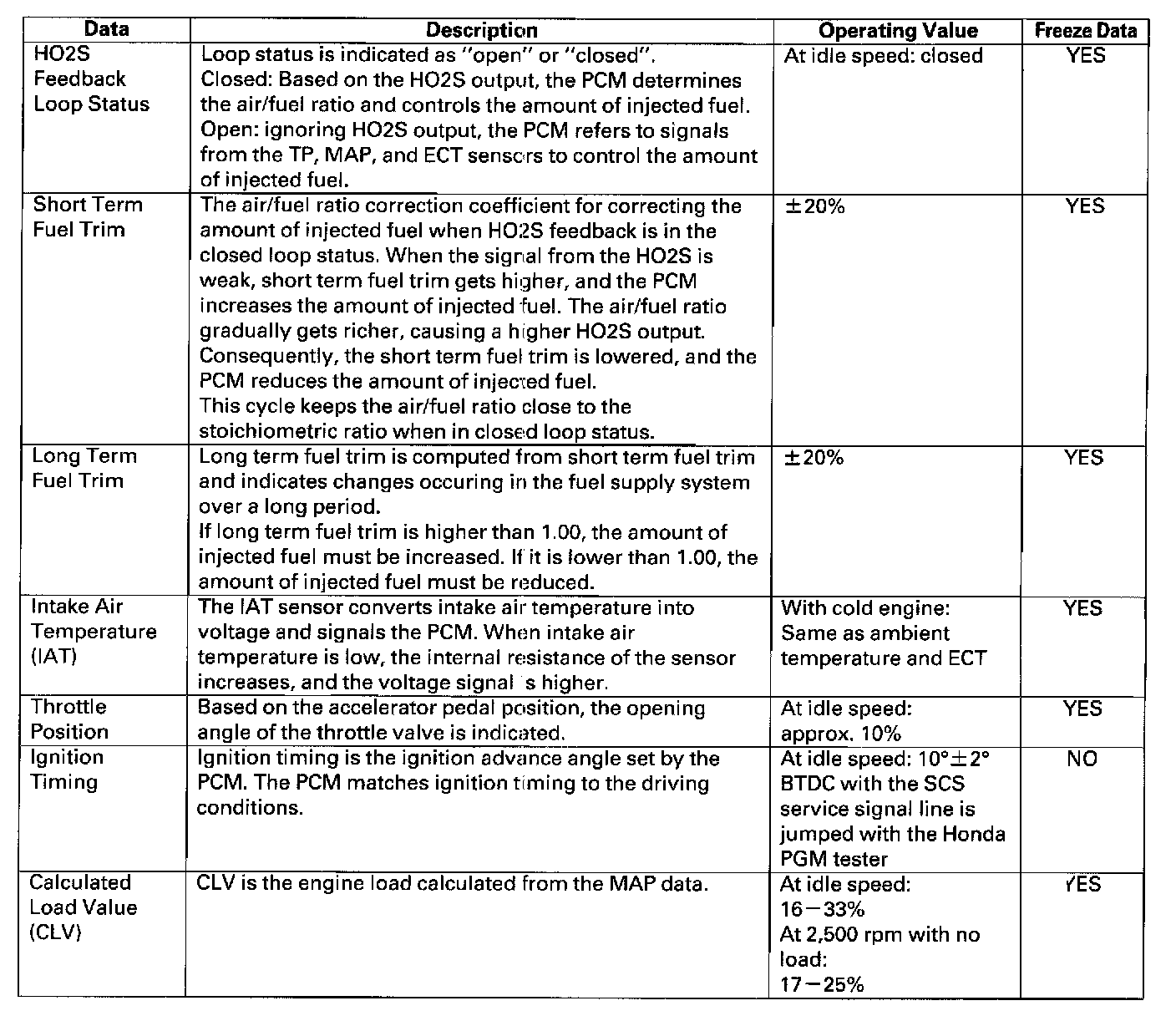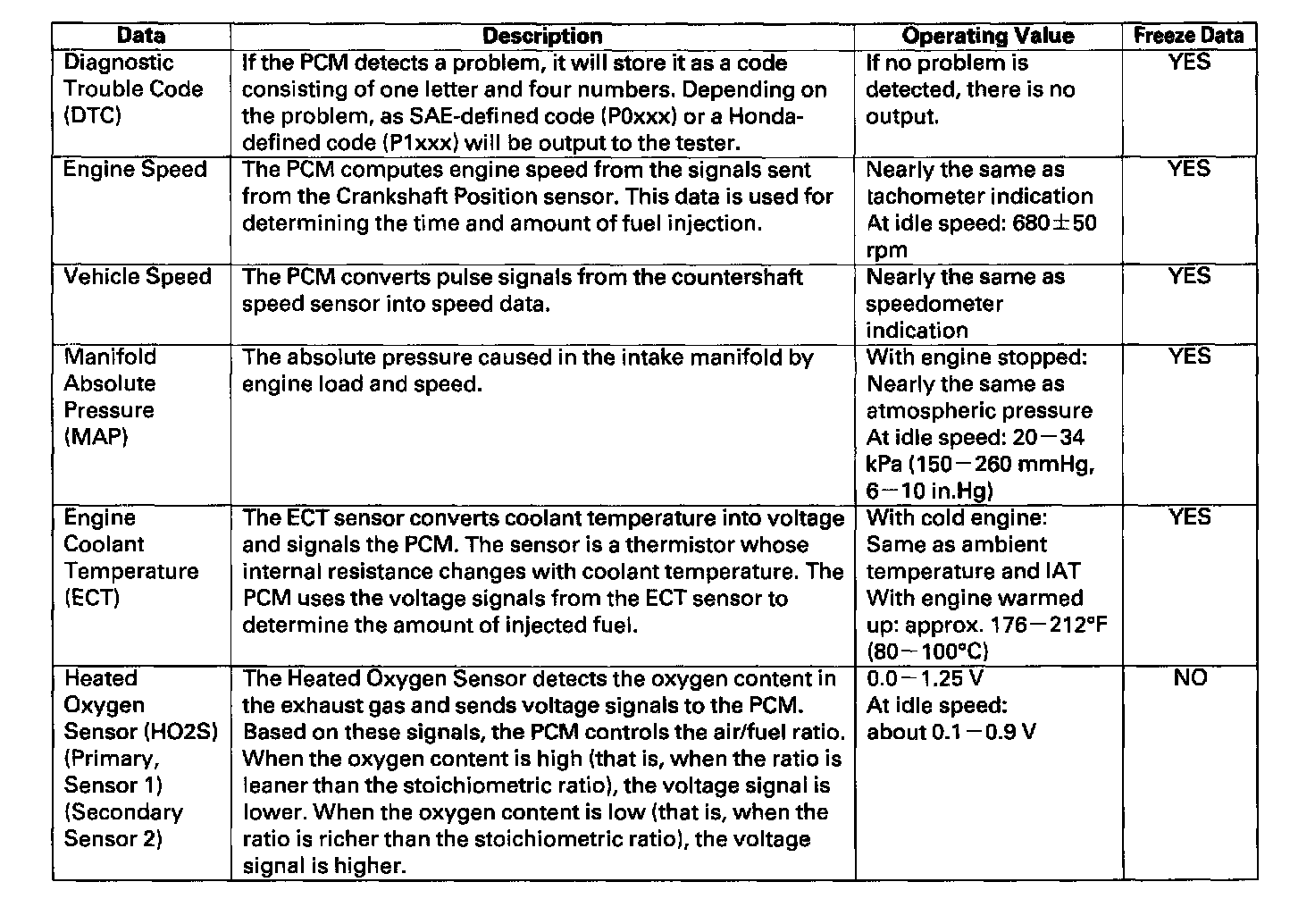 Home >> Honda >> 2000 >> Odyssey EX V6-3.5L >> Repair and Diagnosis >> Powertrain Management >> Computers and Control Systems >> Testing and Inspection >> Scan Tool Testing and Procedures >> Normal Scan Data Values