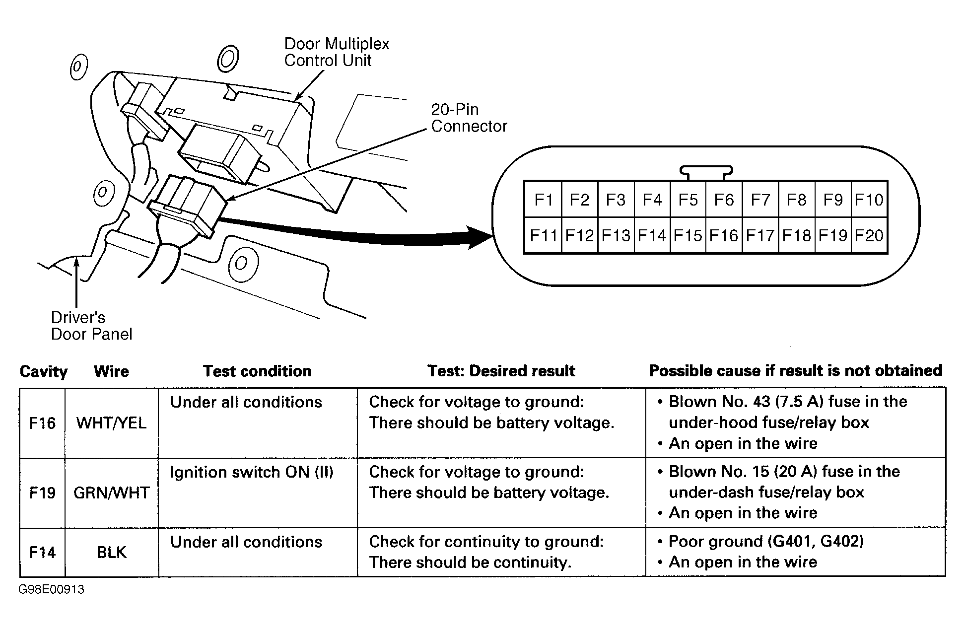 Remove driver's door trim panel enough to gain access to door multiplex control unit connector. Turn ignition off. Disconnect door multiplex control unit 20-pin harness connector. Check connector terminals and contacts. Repair as necessary and retest system. If connector terminals and contacts are okay, perform input tests. See Fig 1 . If test results are as specified, replace power window master switch. See DRIVER-SIDE DOOR POWER WINDOW MASTER SWITCH  under REMOVAL & INSTALLATION.