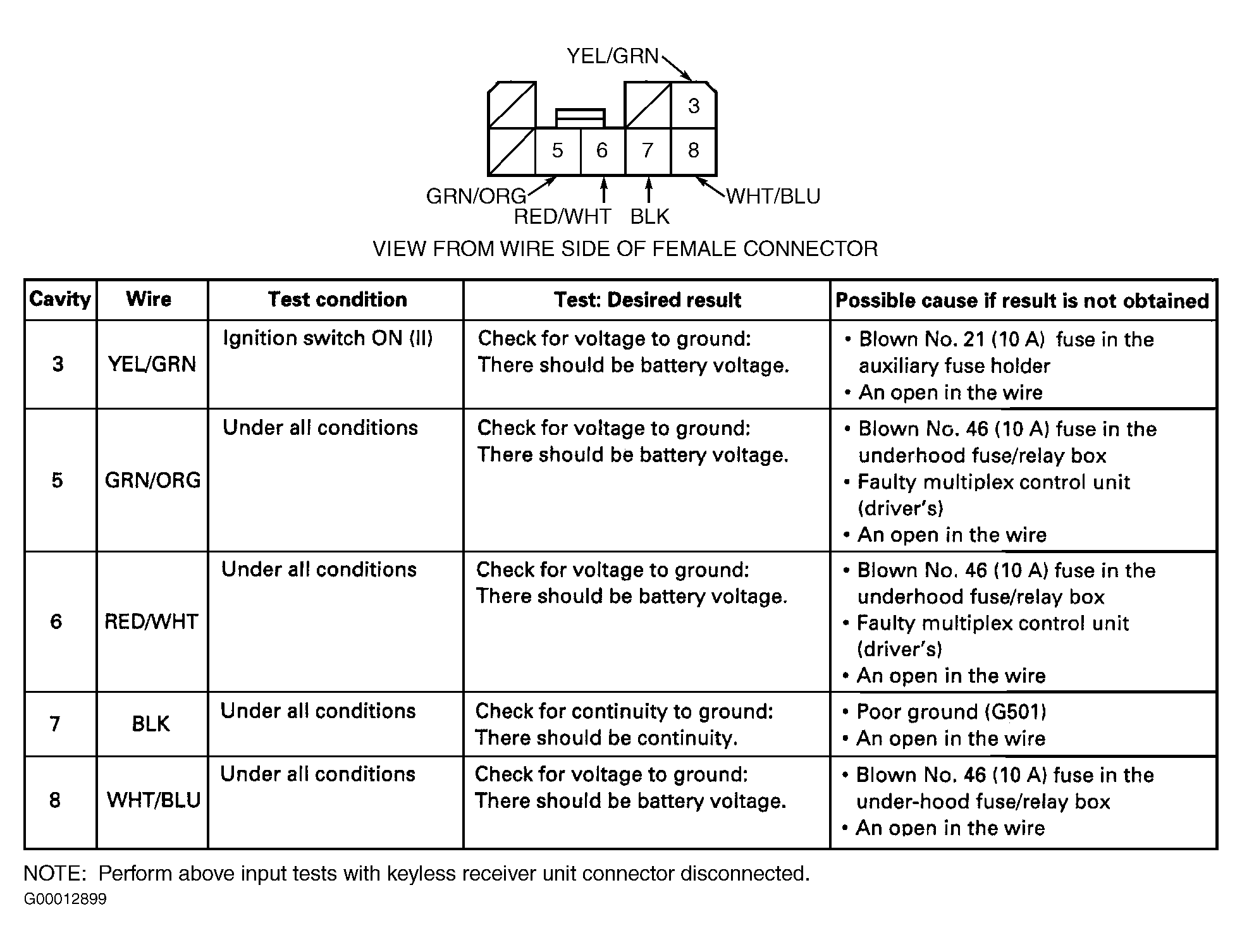1. Remove rear seat. Remove left quarter trim panel. Disconnect keyless receiver unit 8-pin harness connector. Check keyless receiver unit harness connector for loose, damaged or corroded terminals. If problem exists, repair as necessary and retest system. If connector is okay, go to next step.