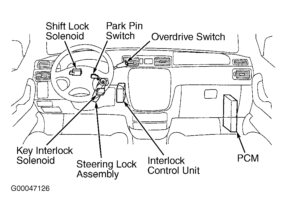 Shift interlock system consists of brake pedal position switch, key interlock solenoid and switch, park pin switch, Powertrain Control Module (PCM) and shift lock solenoid. See Fig 1.