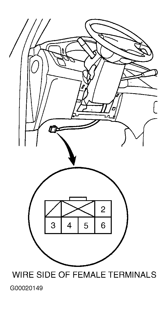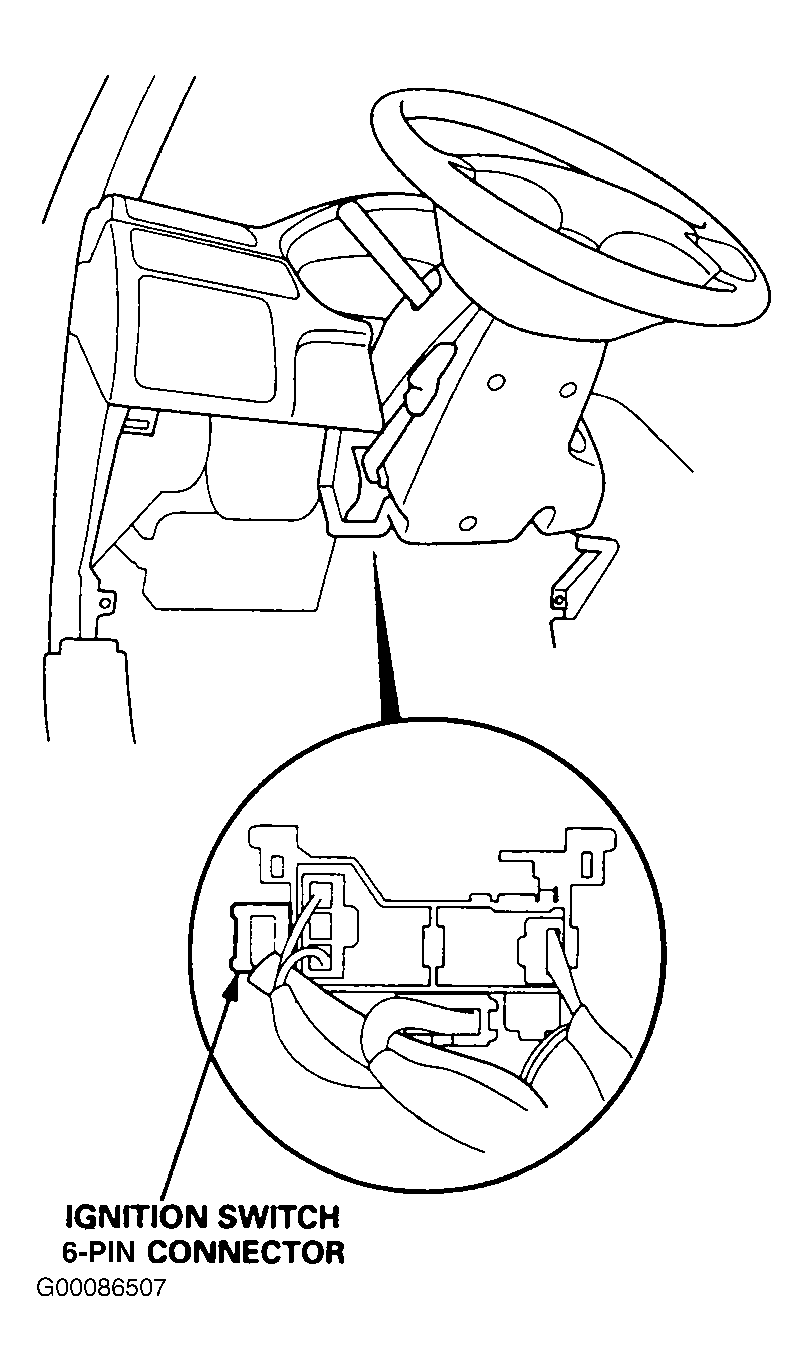 - Turn ignition off. Disconnect 6-pin steering lock harness connector located behind left side of dash. See Fig 1. Connect steering lock harness connector terminal No. 4 (White wire) to battery voltage and connect terminal No. 3 (White/Blue wire) to ground. See Fig 2. A clicking sound should be heard from key interlock solenoid. If key interlock solenoid operates properly, go to next step. If key interlock solenoid does not operate properly, replace ignition key cylinder/steering lock assembly. See STEERING COLUMN SWITCHES
