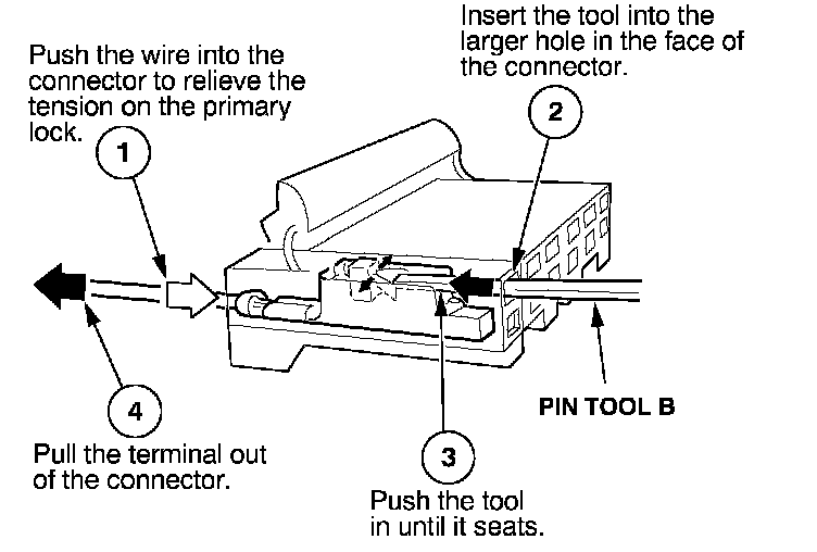 Before you begin, inspect the wire you are about to repair for damage and length. Make sure the wire will be long enough to make a terminal repair without stretching it when you reinstall the terminal in the connector. If the wire is too short, or if access to the connector is too restricted to make a terminal repair, you may need to install a pigtail terminal (a short length of wire with a factory-crimped terminal on it). Refer to HOW TO INSTALL PIGTAIL TERMINALS.