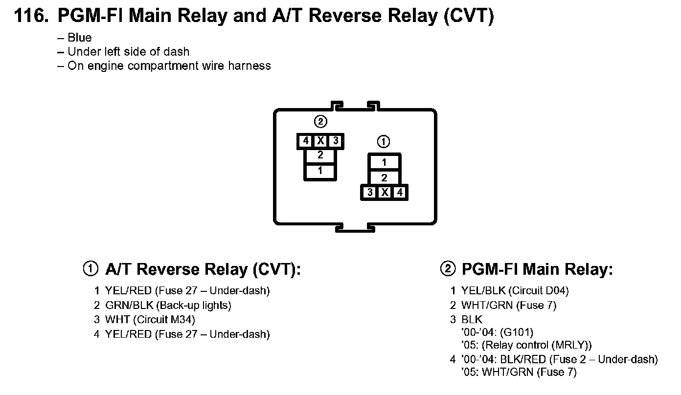 116. PGM-FI Main Relay And A/T Reverse Relay (CVT):