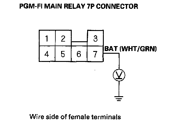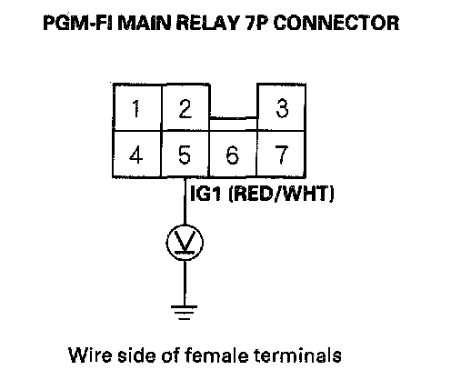 6. Turn the ignition switch ON (II), and measure voltage between body ground and the PGM-FI main relay 7P connector terminal No.5.