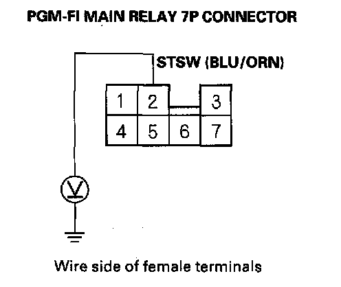 8. Shift to Park, then turn the ignition switch to the START (III) position, and measure voltage between body ground and the PGM-FI main relay 7P connector terminal No.2.