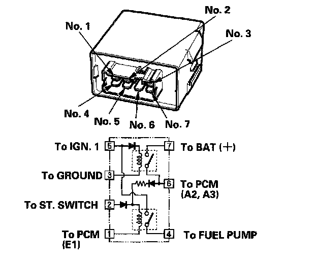 21. Connect battery power to the PGM-FI main relay 7P connector terminal No.6, and connect ground to the PGM-FI main relay 7P connector terminal No.1. Then check for continuity between the PGM-FI main relay 7P connector terminals No.5 and No.4.