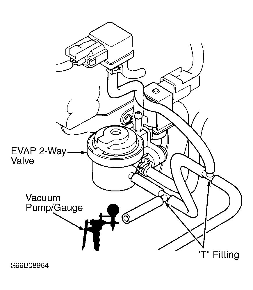 - Turn ignition off. Connect 2 "T" fittings and vacuum pump to hoses between EVAP canister and EVAP 2-way valve as illustrated. See Fig 1