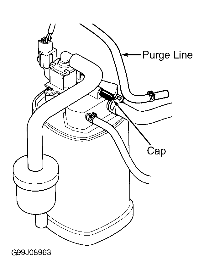 - Turn ignition off. Disconnect purge line hose from canister and plug hose. See Fig 4