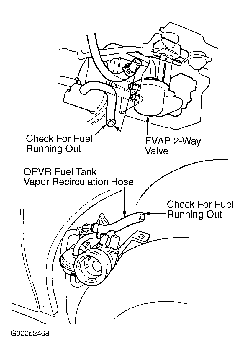 Fill fuel tank with fuel and check for fuel in EVAP 2-way valve and ORVR fuel tank vapor recirculation hose. See Fig 1. Tiny droplets of fuel are normal for both locations. If fuel ran out at either location, replace ORVR fuel tank vapor control valve. If fuel does not run out at either location, ORVR fuel tank vapor control system is okay.