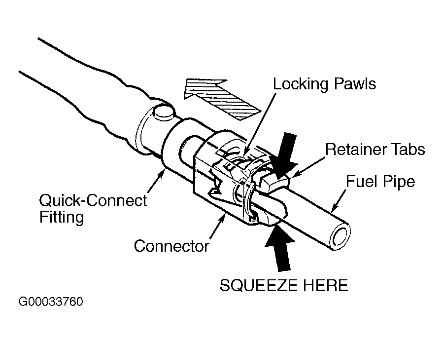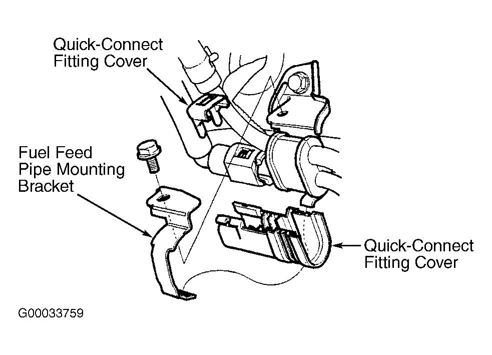 2. Remove fuel filler cap. Disconnect negative battery cable. Remove fuel feed pipe mounting bracket bolt and bracket. Remove quick-connect fitting covers. See Fig 3. Check and clean dirt from quick-connect fittings. Place shop towel over quick-connect fitting. Hold connector in one hand and using other hand, squeeze retainer tabs to release them from locking pawls. Pull connector apart. See Fig 2. Check fitting for dirt and damage.
