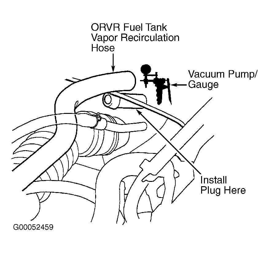 Ensure fuel tank is less than half full. Remove fuel fill cap to relieve pressure and reinstall cap. Disconnect ORVR fuel tank vapor recirculation hose and connect a vacuum pump/gauge to hose. Plug ORVR fuel tank vapor recirculation line. See Fig 1. Apply vacuum to hose. If vacuum does not hold, float is okay. Go to VALVE TEST . If vacuum holds, replace ORVR Fuel Tank Vapor Control Valve.