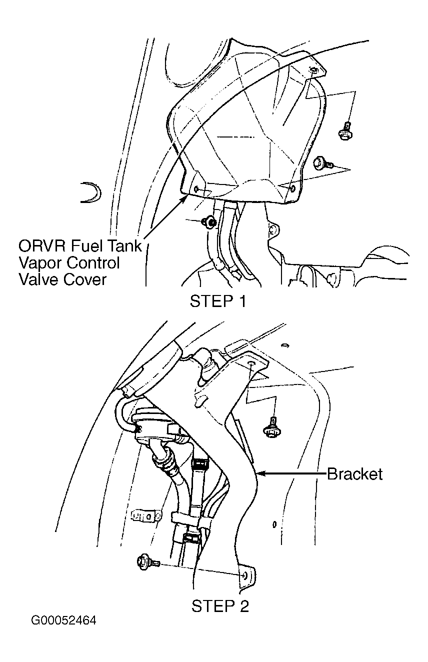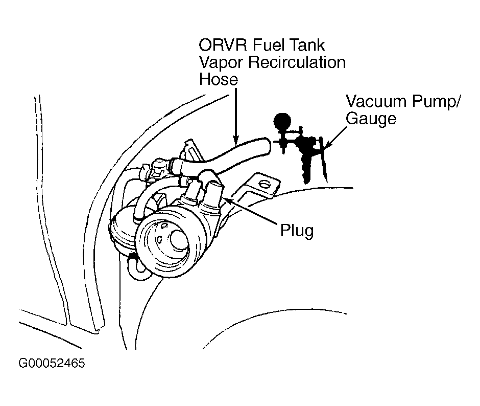 Ensure fuel tank is less than half full. Remove fuel fill cap to relieve pressure and reinstall cap. From inside left rear fender panel, remove ORVR fuel tank vapor control valve cover. See STEP 1 in illustration. See Fig 1. Remove bolts from bracket and remove bracket. See STEP 2 in illustration. See Fig 1. Disconnect ORVR fuel tank vapor recirculation hose and connect a vacuum pump/gauge to hose. Plug ORVR fuel tank vapor recirculation line. See Fig 2. Apply vacuum to hose. If vacuum does not hold, float is okay. Go to VALVE TEST . If vacuum holds, replace ORVR Fuel Tank Vapor Control Valve.
