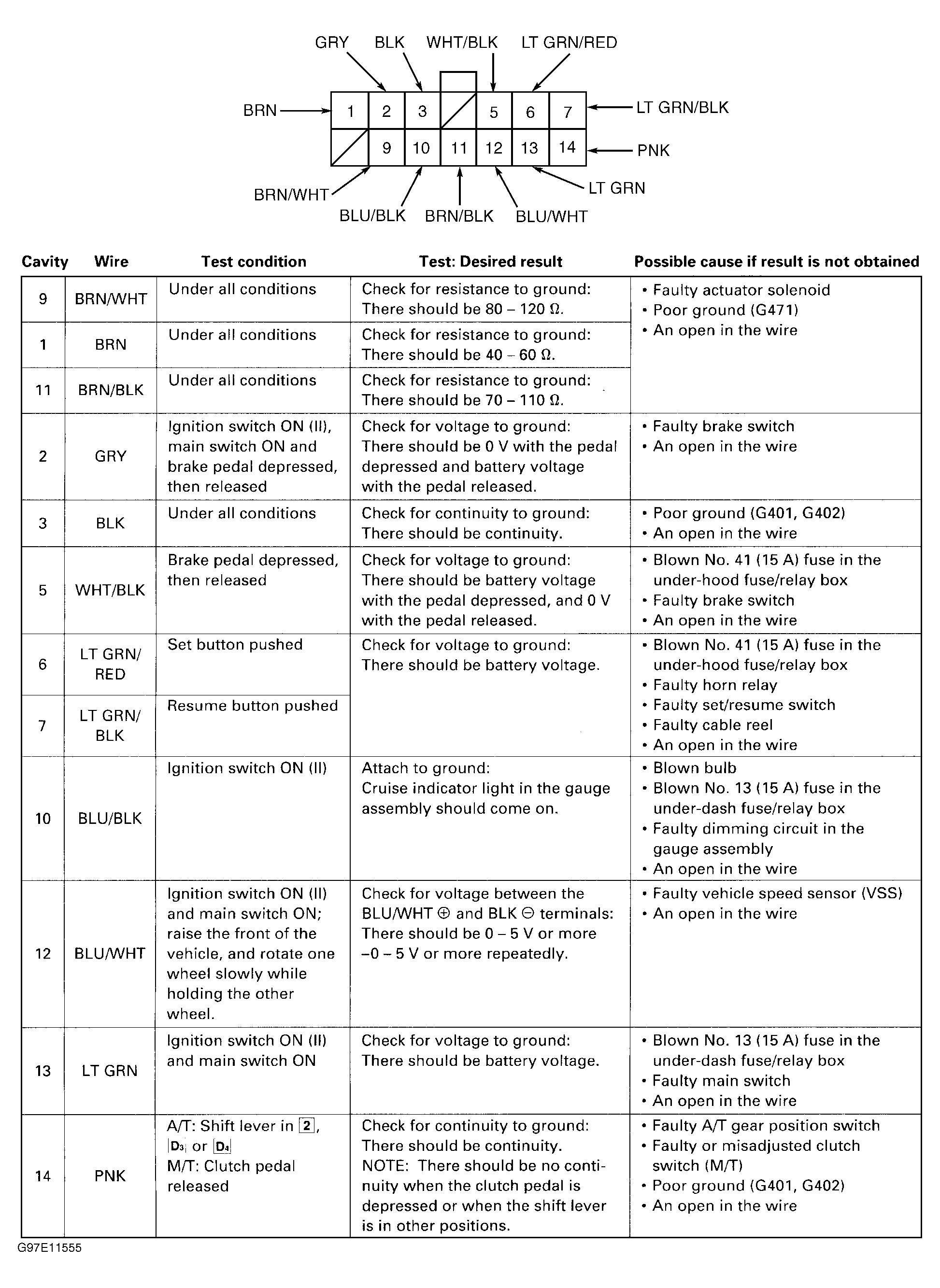 1. Turn ignition off. Remove driver's side instrument panel lower cover. Disconnect cruise control unit 14-pin connector. See COMPONENT LOCATIONS  . Inspect connectors for loose, damaged or corroded terminals. If problem exists, repair connector(s) and retest cruise control operation. If problem does not exist, go to next step.