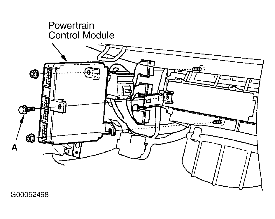 - Disconnect negative battery terminal. PCM is located behind glove box. See COMPONENT LOCATIONS in SYSTEM & COMPONENT TESTING article. Gently pull down dashboard lower cover edge nearest glove box to release clips at front edge of instrument panel. Pull dashboard lower cover away to release pins from holders at rear of instrument panel.