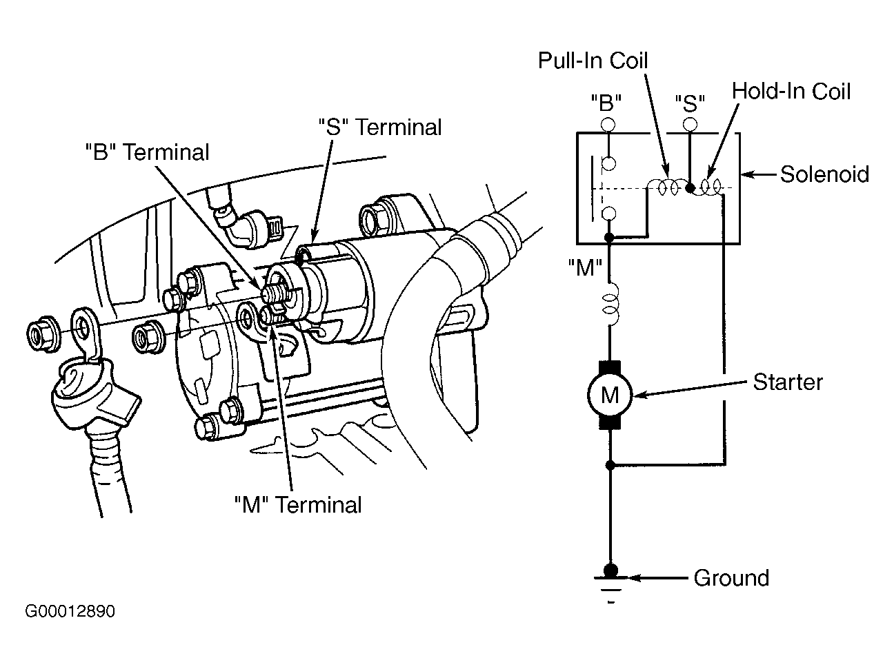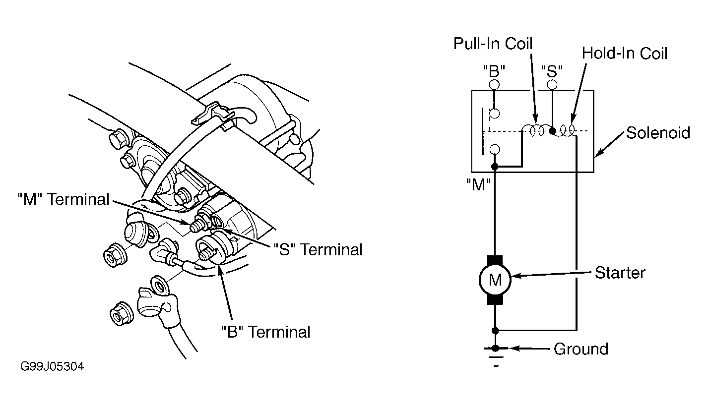 - Check continuity between starter solenoid terminals "S" and "M". See Figure-Figure . If continuity exists, pull-in coil is okay. If continuity does not exist, replace starter solenoid.