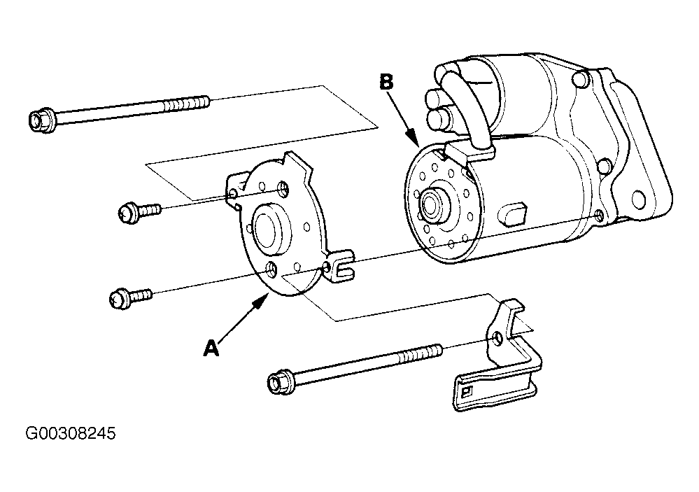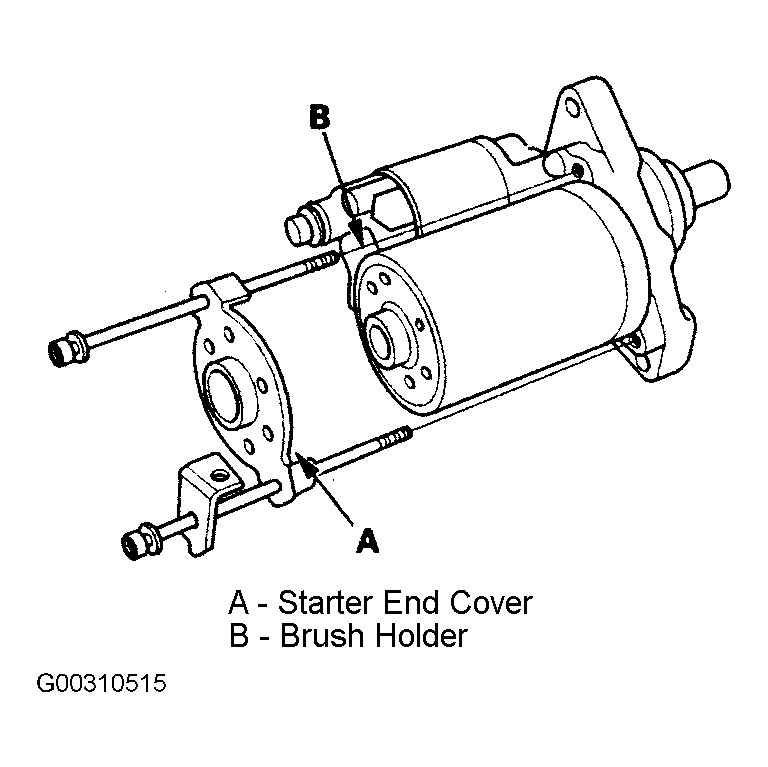 - Install the starter and cover (A) to retain the brush holder (B). See Fig 3 (2.3L) or Fig 4.