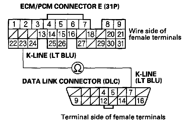 NO - Repair open in the wire between DLC terminal No. 7 and the ECM/PCM (E23). After repairing the wire, check the DTC with the OBD II scan tool/Honda PGM Tester, and go to the DTC Troubleshooting index. Diagnostic Trouble Code Descriptions