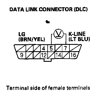 13. Measure voltage between DLC terminals No. 5 and No. 7.