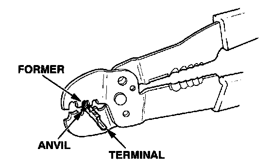 4. Position the terminal in the crimping tool slot with the solid portion of the terminal toward the anvil and the open section toward the former.