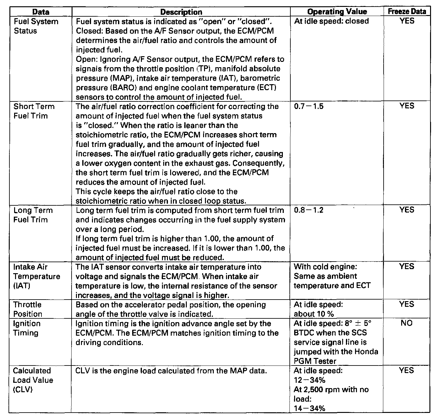 Home >> Honda >> 2002 >> CR-V LX 4WD L4-2.4L >> Repair and Diagnosis >> Powertrain Management >> Computers and Control Systems >> Testing and Inspection >> Scan Tool Testing and Procedures >> Normal Scan Data Values
