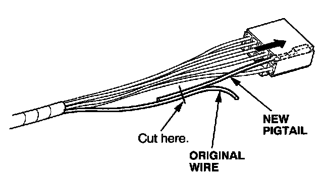 6. Lay the pigtail and the original wire side-by-side, and cut off both ends at once. If you are making more than one splice, do not cut each pigtail at the same location; the resulting "lump" of splice connectors would interfere with rewrapping the harness. Instead, cut the first pigtail close enough to the terminal so you will have room to make each remaining cut about 20 mm (3/4 inch) farther down on the next pigtail.