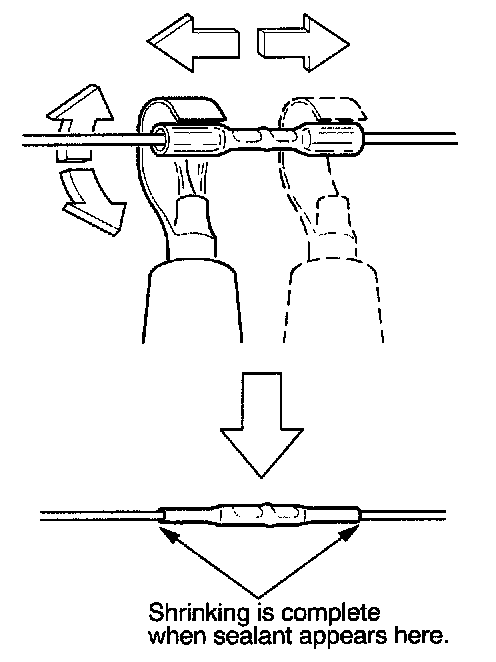 13. Plug in the heat gun, and turn it on. Start at the middle of the splice connector, and move the gun toward the ends as the tube shrinks. Apply heat evenly by rotating the curved heat spreader around the splice connector. Shrinking is complete when a small amount of sealant appears at each end of the tube.