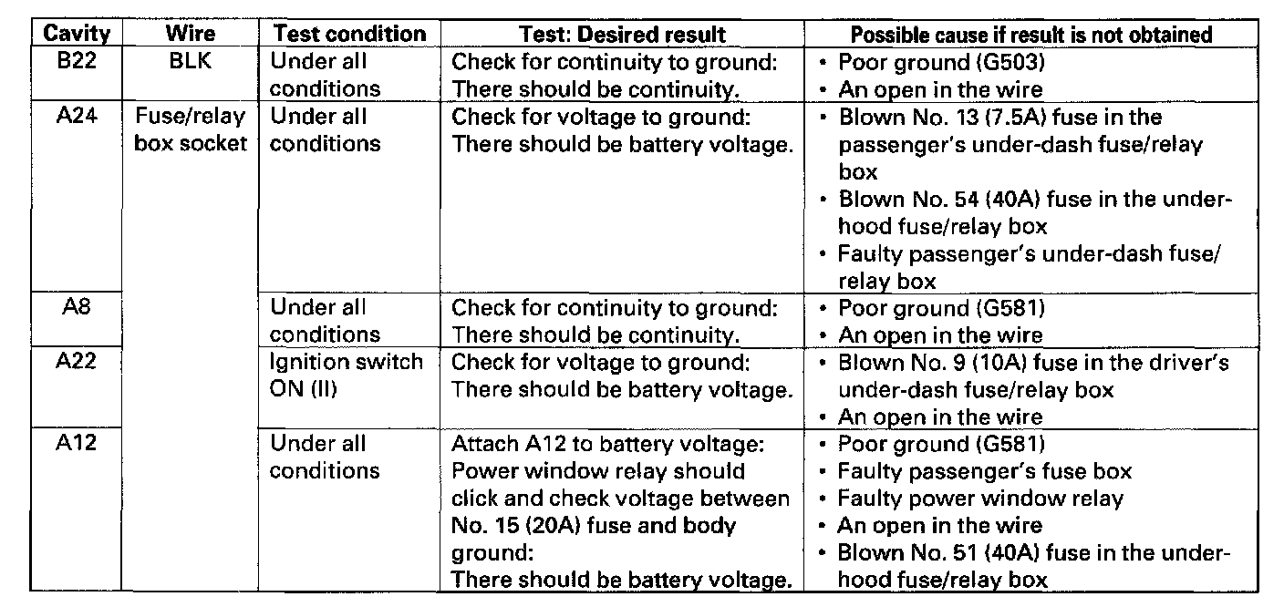 6. Make the following input tests at the connector B and fuse/relay box socket.