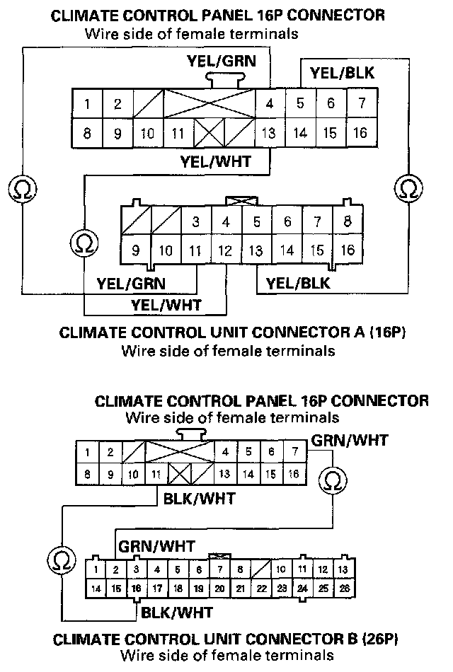 7. Check for continuity between the following terminals of climate control panel 16P connector, and climate control unit connectors A (16P) and B (26P).