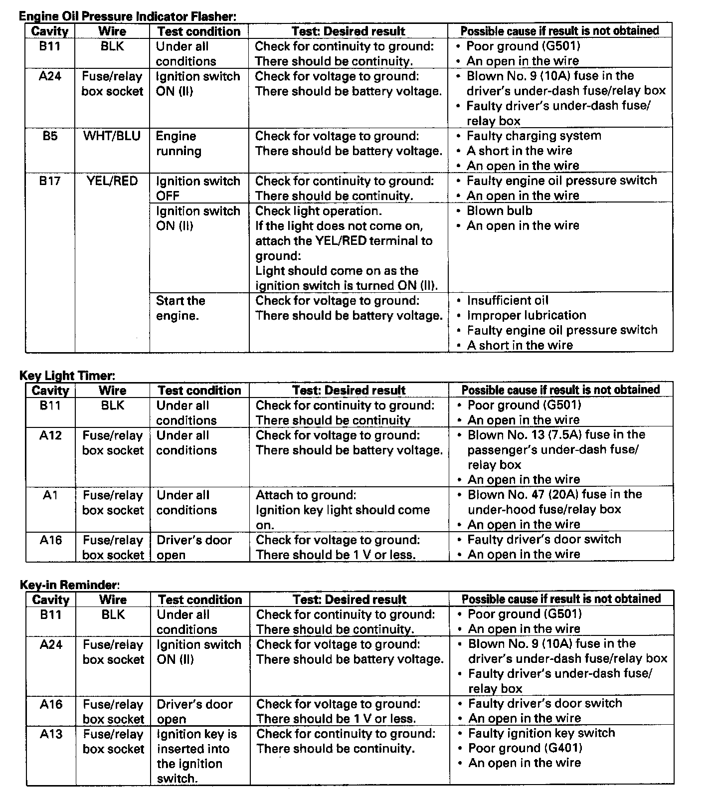 Lights-on, Key-in, Seat Belt Reminder, Key Light Timer, and Engine Oil Pressure Indicator Systems