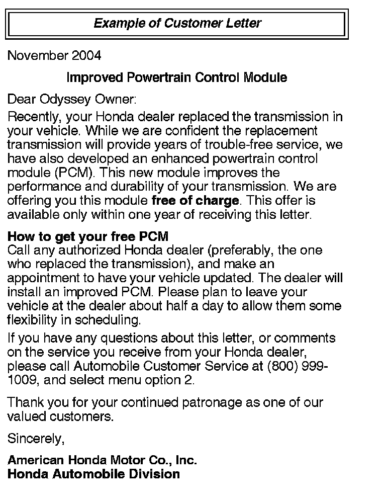 Home >> Honda >> 2002 >> Odyssey EX V6-3.5L >> Repair and Diagnosis >> Powertrain Management >> Computers and Control Systems >> Relays and Modules - Computers and Control Systems >> Engine Control Module >> Technical Service Bulletins >> Recalls >> Campaign - Erratic/Harsh A/T Shifts