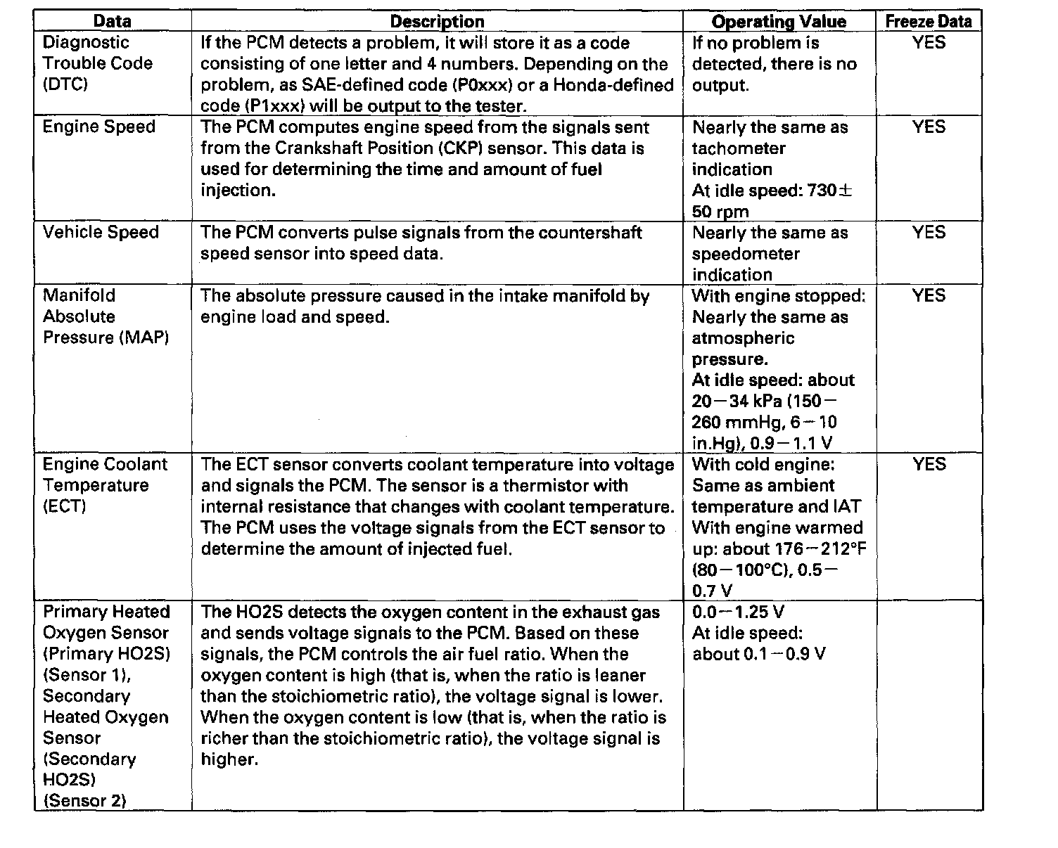 You can retrieve data from the PCM by connecting the OBD II scan tool or the Honda PGM Tester to the Data Link Connector (DLC). The items listed in the table below conform to SAE recommended practice. The Honda PGM Tester also reads data beyond that recommended by SAE. Understanding this data may help you find the causes of intermittent problems.