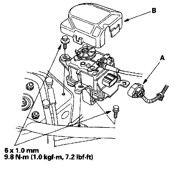 2. Disconnect the 4P connector (A), and remove the actuator cover (B), then remove the bolts securing the actuator.