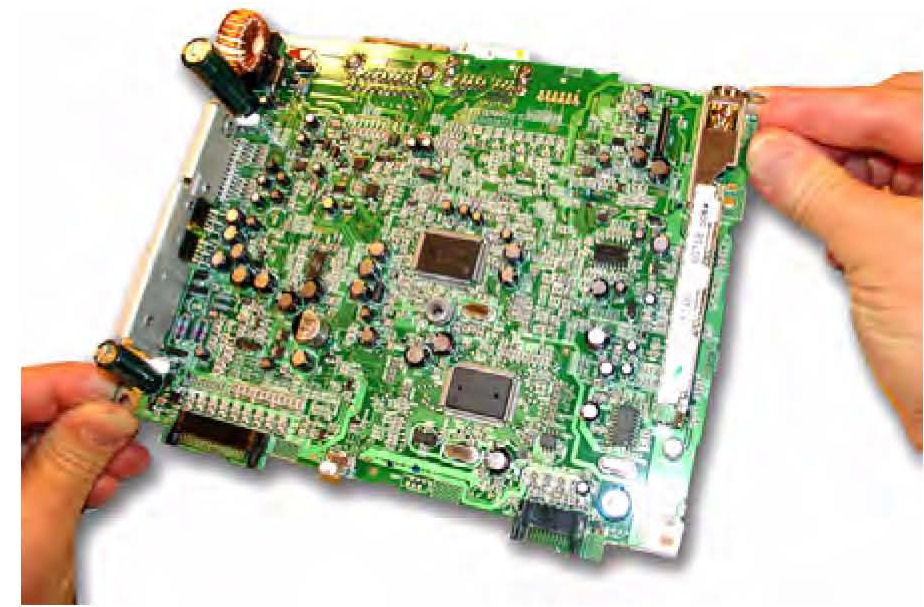 14. Carefully place the new PCB into the audio unit. To ensure proper PCB placement, align the three alignment tabs and screw holes.