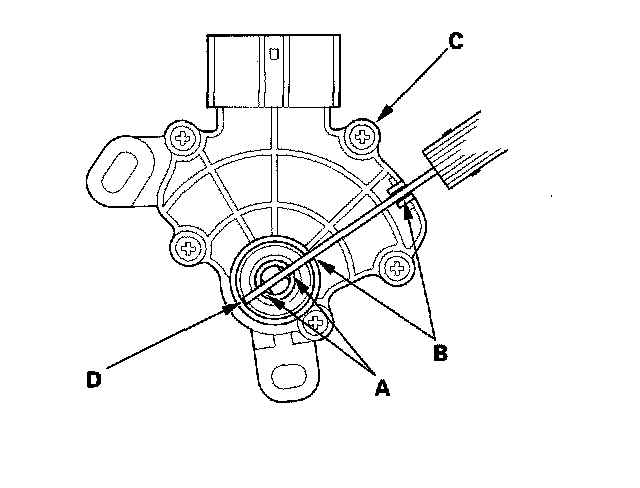 7. Align the cutouts (A) on the rotary-frame with the neutral positioning cutouts (B) on the transmission range switch (C), then put a 2.0 mm (0.08 inch) feeler gauge blade (D) in the cutouts to hold the switch in the N position.