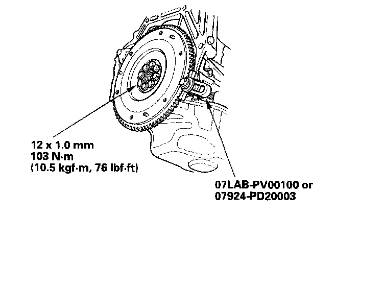 Install the special tool, then torque the flywheel mounting bolts in a crisscross pattern in several steps.