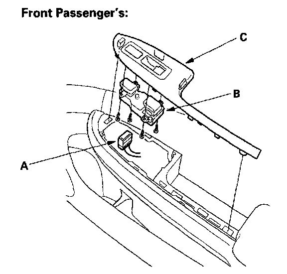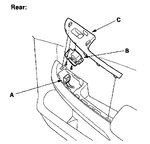 2. Disconnect the power window switch connector (A), then remove the three mounting screws and the power window switch (B) from the switch trim (C).