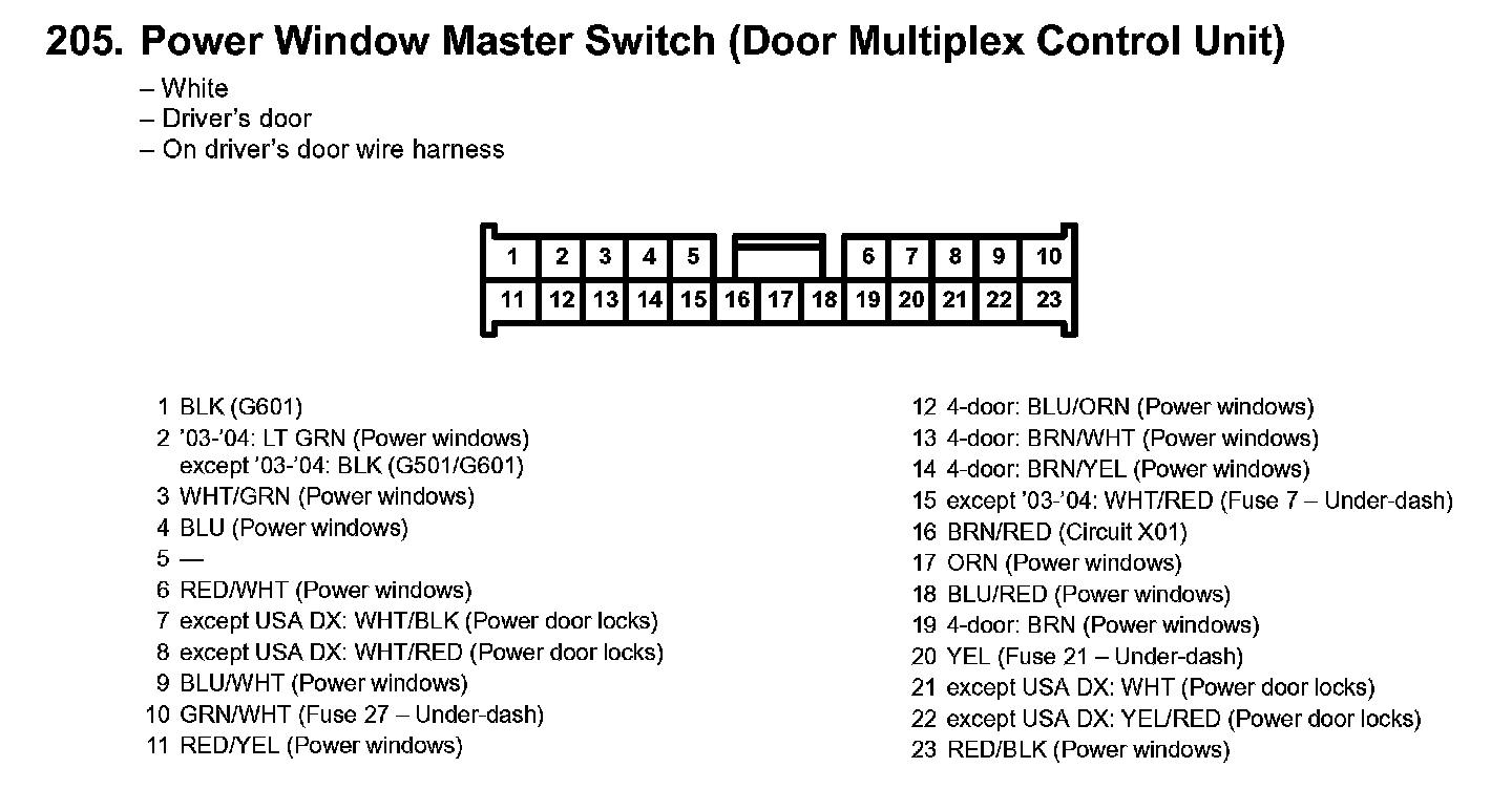 205. Power Window Master Switch (Door Multiplex Control Unit):