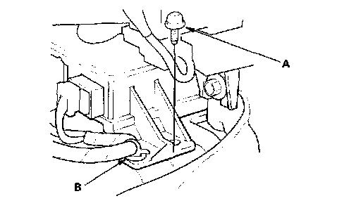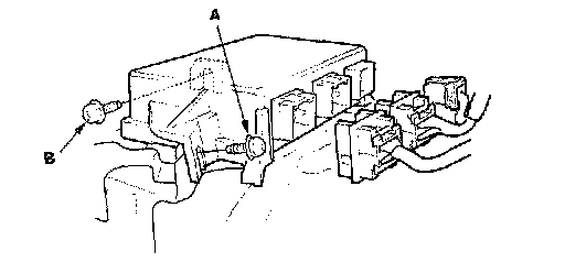 7. Pull down the carpet on the right side, then remove the Torx bolt (A) and the harness clip (B) from the SRS unit.