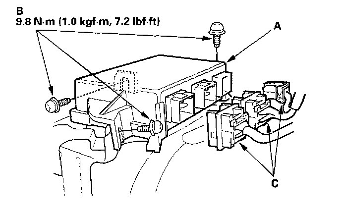 1. Install the new SRS unit (A) with Torx bolts (B), then connect the connectors (C) to the SRS unit; push them into position until they click.