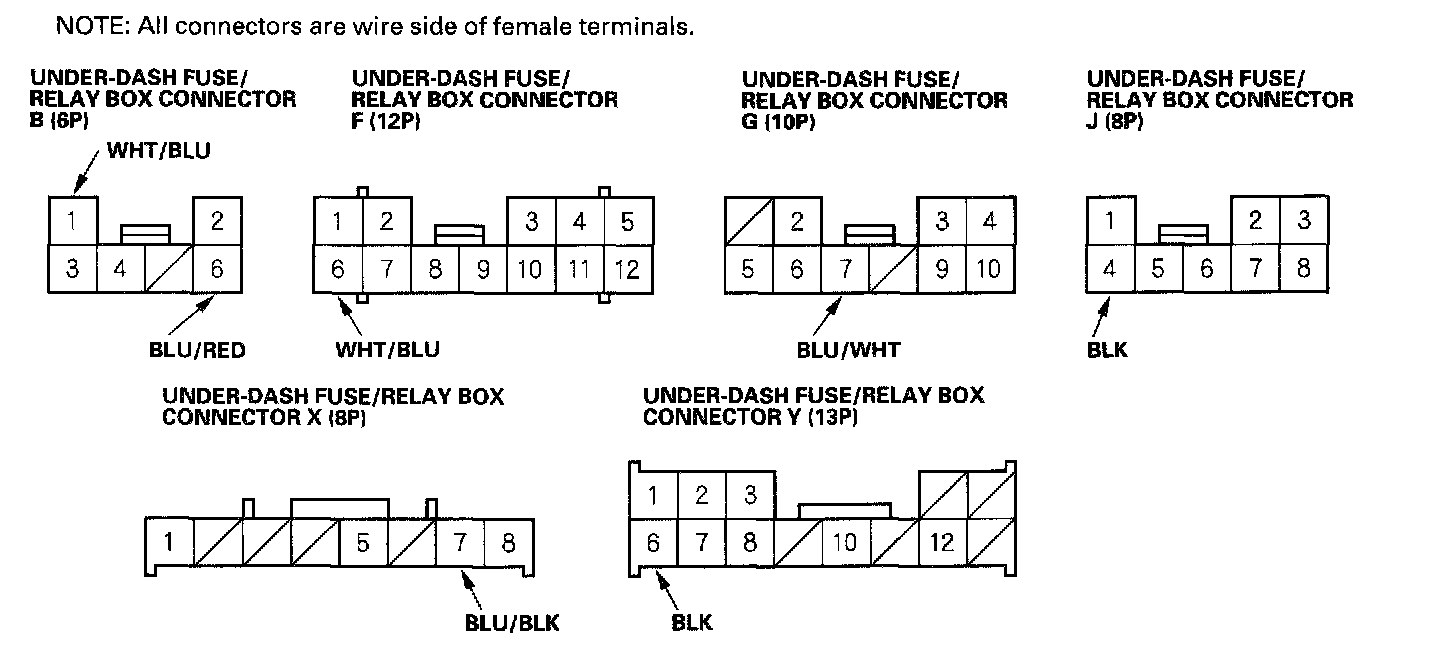 3. Disconnect the under-dash fuse/relay box connectors B, F, G, J, X and Y.