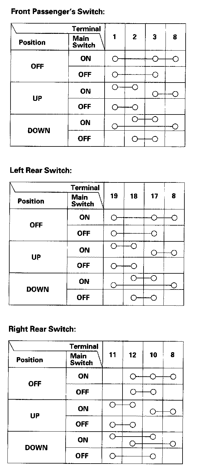 3. Check for continuity between the terminals in each switch position according to the tables.