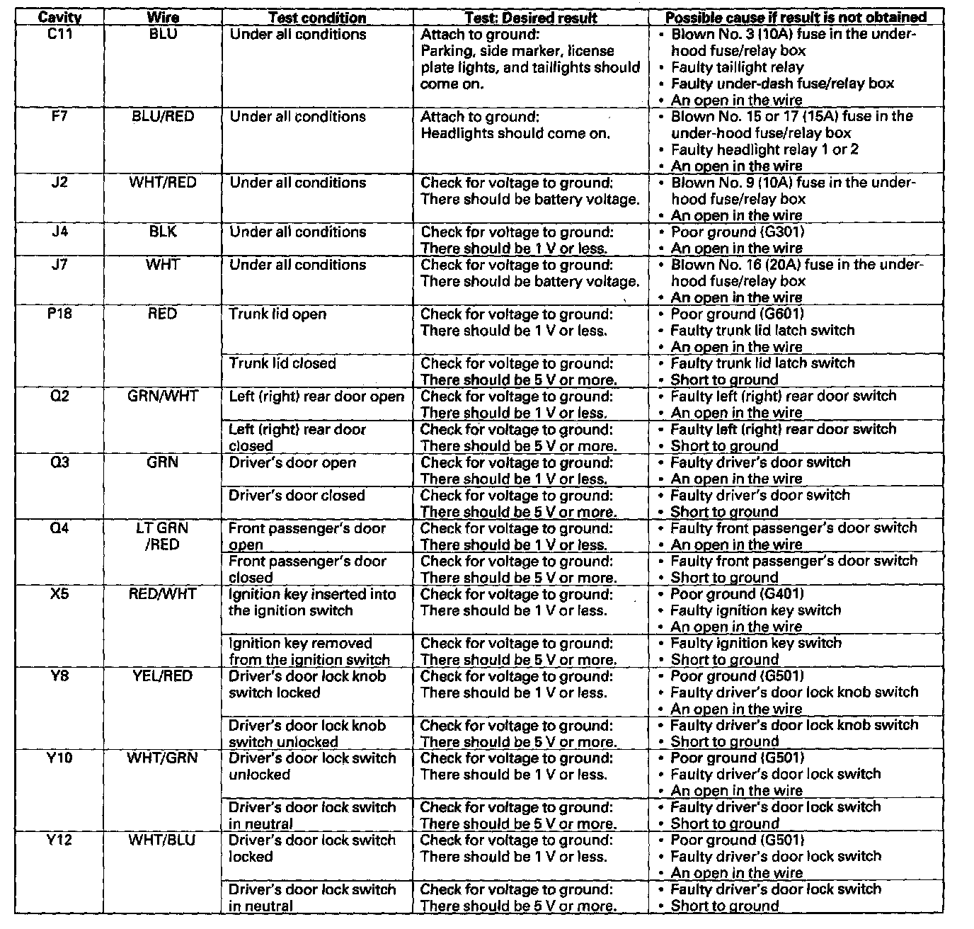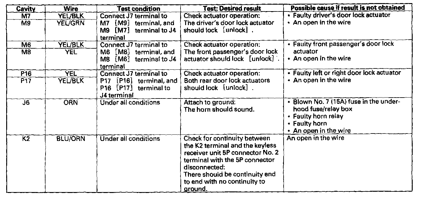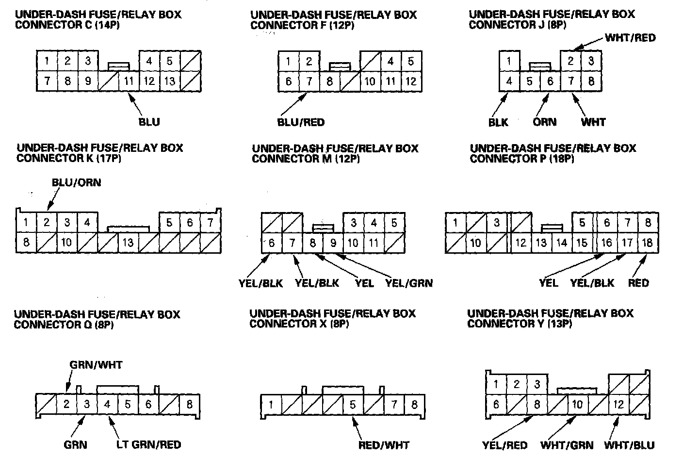 6. Disconnect the M, P, K and J connectors from the under-dash fuse/relay box, and make these input tests at the connectors.