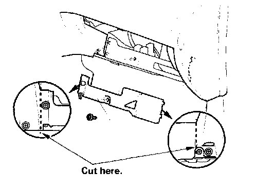 3. Remove the bolt. Cut the plastic cross brace in the glove box opening with diagonal cutters in the area shown, and discard it.