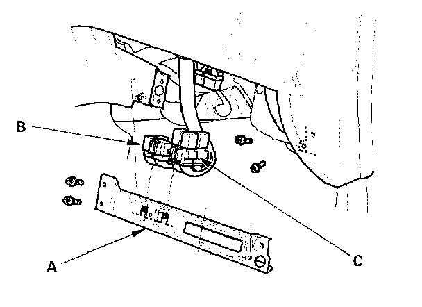 4. Remove the bolts and the glove box frame (A), then remove the connectors (B) and relay holder (C).