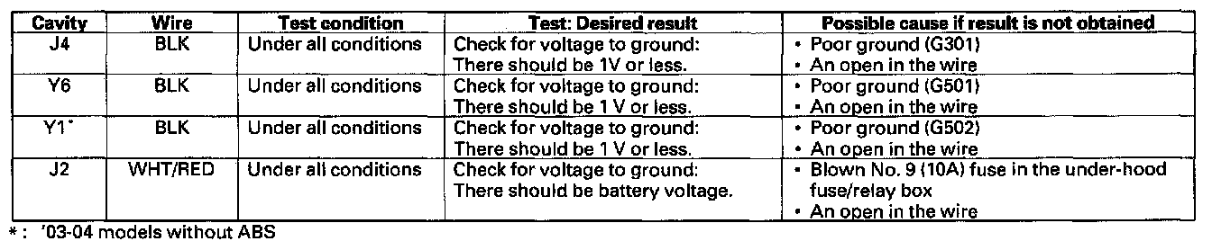 5. Reconnect the connectors to the under-dash fuse/relay box, and make sure these input tests at the appropriate connectors on the under-dash fuse/relay box.