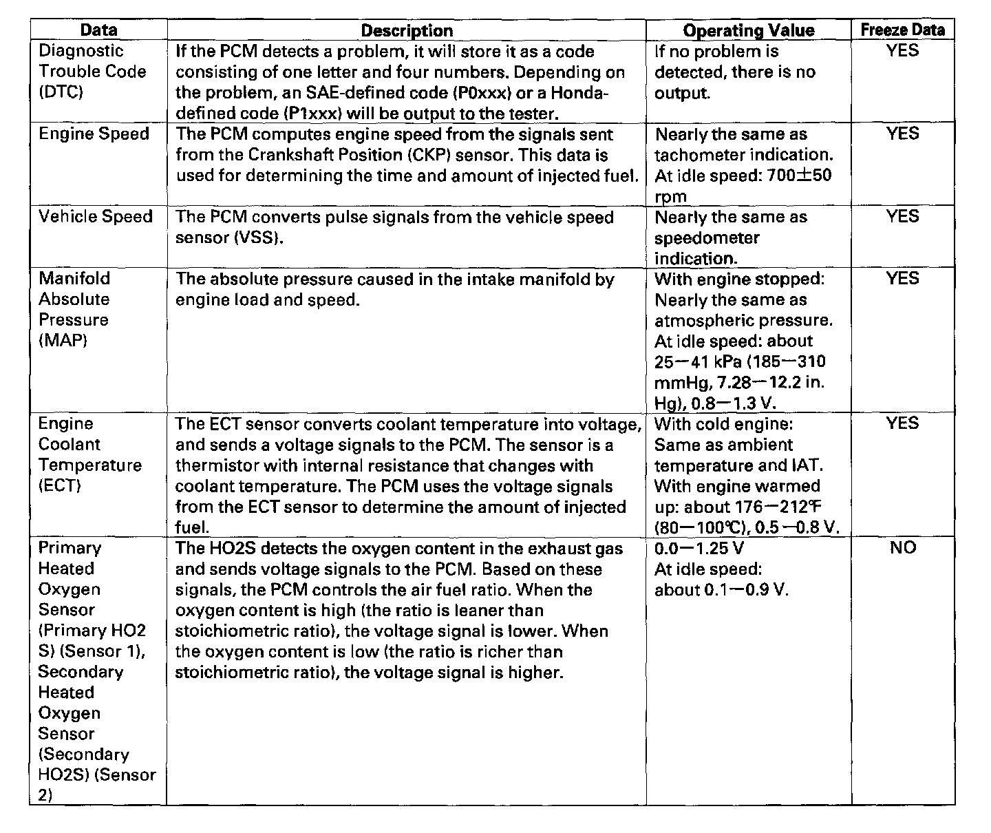 You can retrieve data from the PCM by connecting the OBD II scan tool or the Honda PGM Tester to the Data Link Connector (DLC). The items listed in the table conform to SAE recommended practice. The Honda PGM Tester also reads data beyond that recommended by SAE to help you find the causes of intermittent problems.