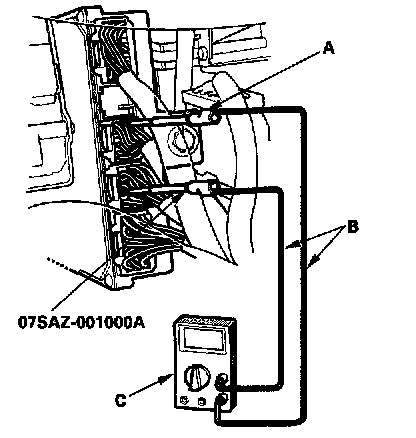 1. Connect the backprobe adapters (A) to the stacking patch cords (B), and connect the cords to a digital multimeter (C).