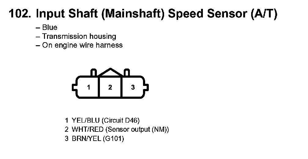 102. Input Shaft (Mainshaft) Speed Sensor (A/T):