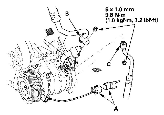10. Disconnect the compressor clutch connector (A), remove the nuts, then disconnect the suction line (B) and the discharge line (0 from the compressor. Plug or cap the lines immediately after disconnecting them to avoid moisture and dust contamination.